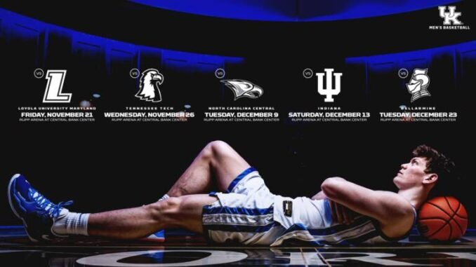 LEXINGTON, Ky. – The excitement continues to build around Mark Pope’s second year as Kentucky’s head coach. On Friday, the Wildcats officially unveiled five nonconference home games for the 2025–26 season, including a long-awaited border battle against Indiana on December 13. All five contests will take place inside the legendary Rupp Arena at Central Bank Center, setting the tone for another high-stakes campaign in Lexington.