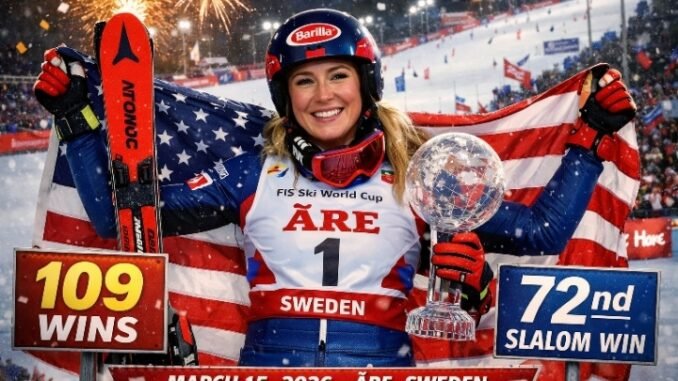 On March 15, 2026, the snow-covered slopes of Åre once again bore witness to history as Mikaela Shiffrin carved her way to a remarkable 109th career victory in the FIS Alpine Ski World Cup. It was not just another win it was a powerful statement in what has become one of the most dominant seasons ever seen in alpine skiing. With this triumph, Shiffrin secured her eighth victory of the 2026 campaign and her astonishing 72nd win in the slalom discipline, reinforcing her position as the undisputed queen of technical skiing.