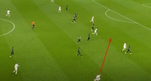 As seen in the image above, area opened up for Sarr and he was alert to the possibility, bursting forward and latching onto Dejan Kulusevski’s wonderful skip thru the lines.
